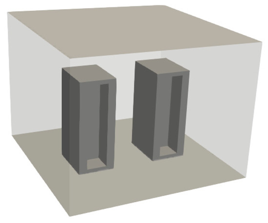 The server room is modelled considering its size (width × depth × height) as well as the racks deployed in it. In general, the utilized CFD tool allows modelling a rack both as a set of separate servers of any occupation pattern or as a simplified single device. Due to performance reasons, we chose the second approach. The racks are considered as fully and homogeneously occupied with servers, their geometry is simplified in a way that each of the racks is treated as single airflow and heat source. They are provided with one inlet and one outlet each, allowing the use of less computationally expensive mesh. Cold air is supplied into the room through the floor surface whereas the return air stream leaves through the ceiling. The intention of such Computer Room Air Conditioning (CRAC) modelling was to create a possibly generic case, independent from location and number of floor supply tiles and return outlets. The virtual server room model used in this study is presented in Figure 6.
