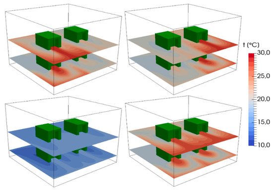All possible CFD-based simulations (considering the Table 1 parameters) were executed and this generated over 200 GB of output data, from which probe data were extracted. Taking into account the number of probes and the number of collected time steps per execution , the total number of temperature records per simulation is equal and the sum for whole described study . The generated data will constitute the training data of our prediction algorithm. Exemplary results for different air conditioning volume flow rate can be seen in Figure 9.