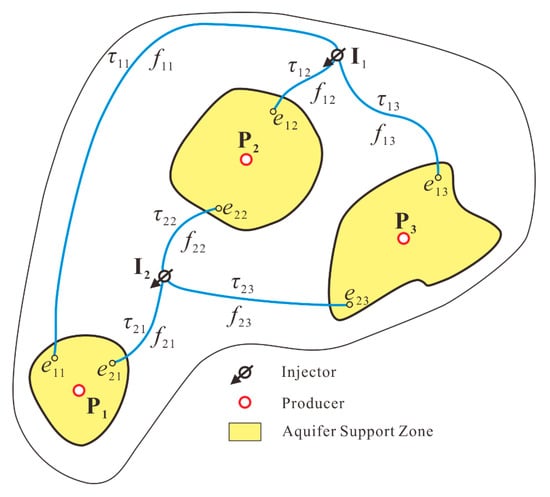 With regard to different CRM representations (e.g., CRMT, CRMP, and CRMIP), the two main parameter of a CRM are connectivity coefficient and time delay constant if BHP data of producers are not available. For an oil–water system, the time delay constant denotes how long a pressure wave from injectors takes to reach a producer. Due to reservoir heterogeneity, time delays of displacing fluid from adjacent injectors to a certain producer may differ from each other significantly. So, assuming only a time delay constant for each producer, as in CRMP, may be unreliable. In such a case, it is necessary to develop one continuity equation for every injector–producer pair, i.e., the CRMIP model. However, the traditional CRMIP model is not suited to investigate the impact of aquifer support on inter-well connectivity estimates, which are widely distributed in karst carbonate reservoirs. As shown in Figure 1, when aquifer support is inevitable, the governing differential equation should be modified, as follows