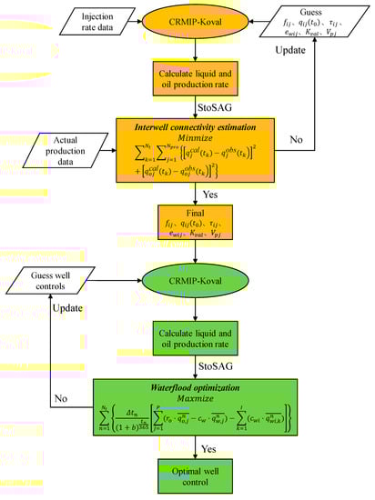 Figure 2 displays the integrated CRMIP–StoSAG workflow for inter-well connectivity estimation and waterflood optimization. This workflow was divided into two parts: data assimilation by the CRMIP–Koval model (shaded in orange) and real-time waterflood optimization based on good understandings of inter-well connectivity relationships (shaded in blue).