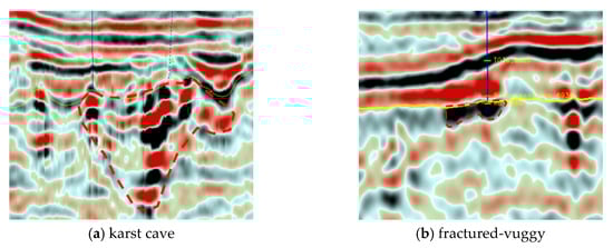 The typical karst carbonate reservoir we consider here is located in northern Tarim Basin, which is subject to strong heterogeneity and contains multiple types of reservoir bodies in many cases, mainly including karst caves, fractured-vuggy bodies, etc. []. As a matter of fact, karst caves are usually regarded as the major reservoir spaces. Rapid drilling time drops, drilling rigs ventilation, overflow and large mud loss often occurs. In addition, strong bead reflection, as shown in Figure 3a, can be utilized to determine the karst cave systems. As for the fractured-vuggy reservoir bodies, the main components are composed of dissolved pores and small caves. In addition to communicating the dissolved pores and caves, a relatively high hydrocarbon storage is founded in high-angle tectonic fractures with varying conductivities. The main seismic amplitude for this type of reservoir body is strong flake and weak messy reflection, see Figure 3b.