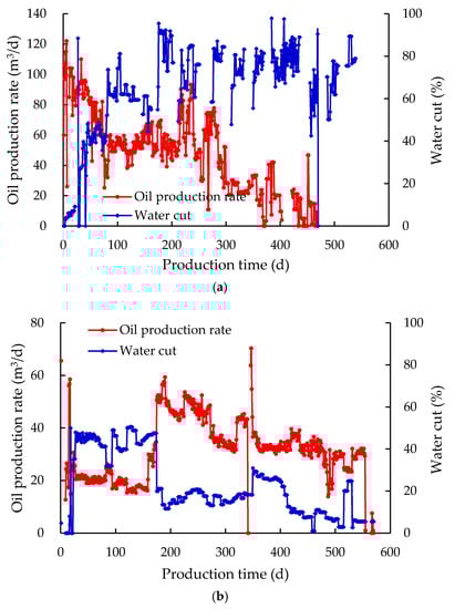 Schematic diagram of typical water influx behavior patterns: (a) abrupt watered-out; (b) fluctuation or staircase rise in water cut.