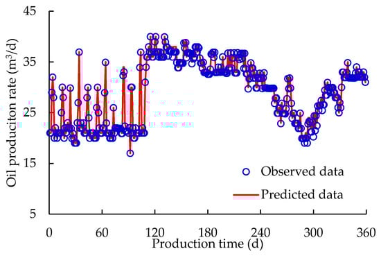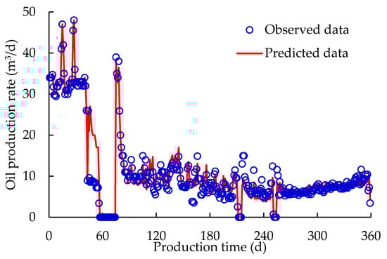 where is the liquid production rate of an injector–producer pair at time t, m3/d; is the time delay constant, d; is the water influx rate, m3/d; is the injection rate of injector i, m3/d; is the liquid production index of an injector–producer pair, m3/(MPa·d); is the bottom hole pressure of producer j at time t, MPa; is the inter-well connectivity coefficient between injector i and producer j, ∈ [0,1].
