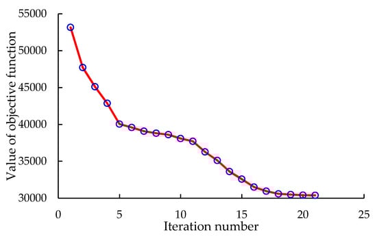According to the problems of rapid production decline and low recovery rate caused by weak natural energy and rapid rise of water cut, pilot tests of sequential waterflooding have been carried out for some potentially interconnected injector–producer pairs, which are sorted out according to tracer surveillance and interference well testing. But with the amount of water injection increasing, oil yield effect gradually becomes worse, and much of the remaining oil is still unexploited around producers. For this study, typical injector–producer-pairs, Pro_1, Inj_1, and Pro_2, corresponding to the same large-scale fractured-vuggy unit, was screened for application for the improved CRM–StoSAG workflow. Using the liquid and oil production data of Pro_1, Inj_1, and Pro_2 with a relatively stable production scheme for history matching, the control variables for inter-well connectivity including connectivity coefficient, time delay constant, water influx rate, Koval factor, and drainage volume of each injector–producer pair were ultimately estimated and summarized in Table 1. The CRMIP oil production match results of Pro_1 and Pro_2 are shown in Figure 5 and Figure 6, respectively. The iteration procedure of the least-squares objective function using the improved CRM–StoSAG workflow for inter-well connectivity estimation is illustrated in Figure 7.