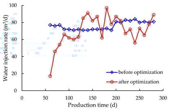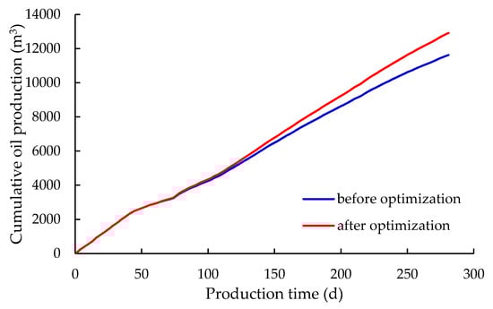 Based on the accurate estimation of inter-well connectivity relationships, water injection rates of Inj_1 at each control step were regarded as unknown control variables, and the NPV of oil production with regard to this large-scale fractured-vuggy unit was maximized using the StoSAG optimization method in order to find the optimal well control variables. Figure 8 displays the optimized distribution of water injection rate at each timestep. Comparison of well group cumulative oil production prior to and after optimization is shown in Figure 9. The result indicates that, when cumulative volume of water injection is assumed constant, the cumulative oil increase of this well group after real-time injection-production optimization in karst carbonate reservoir was equal to 1290.2 m3, indicating a remarkable oil yielding effect. Obviously, the proposed workflow can provide good insights into accurate estimation of dynamic connectivity and subsequent waterflood optimization in karst carbonate reservoirs with aquifer support widely existing.