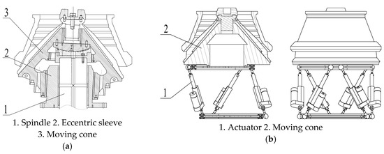 However, there are few studies on the detailed distribution of crushed products of ore under the condition of laminated crushing. Under the condition of laminated crushing, the particle size is various, and the effect is complex. Wang [8], Ma [18], Dong [19], Zhang [20] et al. obtained the mass fraction of a particle with different compression ratios but did not study the product distribution after crushing in detail. With the concept of “industrial 4.0” being put forward, the crushing equipment will also develop towards the direction of intellectualization. Industry 4.0 is a name given to the current trend of automation and data exchange in manufacturing technologies, which includes cyber-physical systems, the Internet of things, cloud computing and cognitive computing; industry 4.0 fosters what has been called a “smart factory”. Smart crushing equipment will realize the concept of precision crushing and other crushing attributes. A large amount of research has been done on the intelligent control of cone crushers. In 1994, Bayliss [21] et al. proposed the use of artificial intelligence (AI) tools in cone crushers. The main implementation methods are using automatic control [22] and mechatronics [23]. However, limited by the structure of traditional cone crushers, only the processes of feeding, discharge, and crushing was regarded [24,25]. The structure of the intelligent cone crusher is shown in Figure 1b. Compared with the traditional cone crusher in Figure 1a, the biggest difference is that the eccentric sleeve in the non-adjustable moving cone is replaced by an actuator in the adjustable moving cone. Therefore, the compression ratio can be automatically adjusted according to the particle size of the material in the crushing chamber. Thereby, the particle size of the crushed product can be optimal, and the intelligent cone crusher can achieve the goal of “precise crushing”.
