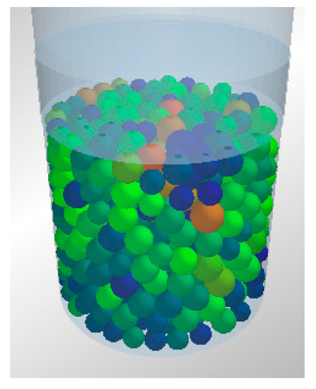 In mixed particles, one particle may contact other particles, and the contact probability is the ratio of the volume of other particles to the total volume of the material. So, d2 is modified to , the average particle size of total particles. The compression force F and the compression ratio η are different from those of two single particles when they are in contact with each other. It is necessary to regard the above situation as two-particle contact. The EDEM confining pressure simulation condition is shown in the Figure 2. With the simulation, the compression force data of each particle can be obtained. So, according to Equations (1) and (2), the relative compression ratio can be calculated.