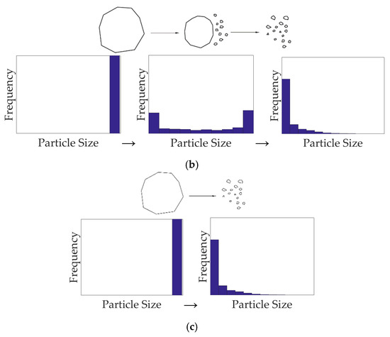 Changing particle size and mass fraction according to typical breakage models: (a) Volume breakage model; (b) Surface area breakage model; (c) Uniform breakage model.