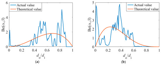 The integral interval of beta distribution is (0, 1), and there are two parameters α, β > 0 of beta distribution. The shape and skewness of the beta distribution curve can be changed by adjusting alpha and beta. When α, β < 1, the curve shows a bimodal state. Therefore, the crushed products can be described by a beta distribution. Assuming that the ratio of the particle size of broken products do to the original particle size di obeys a beta distribution, Equation (12) can be obtained: