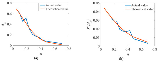 The bonding parameters of particles are set according to basalt. The normal cohesion is set to 25 Mpa. Using EDEM simulation under the condition of single-layer crushing, the actual distribution and the theoretical probability density function of beta distribution after parameter estimation of crushed products consisting of 160 mm-diameter particles under different compression ratios of single particles are shown in the Figure 9. The mechanical parameters of the simulation are set according to mechanical parameters of basalt, which is same material as in the in experiments in Section 5. The function of the mean and variance of crushed products of 160 mm-diameter particles and the different total compression ratio are shown in Figure 10.