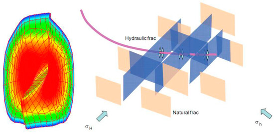 In the extensive study of tight reservoirs, it is also found that the fracture formation process in tight reservoirs is complex and diverse. The fracture form (such as the Figure 1) is mainly influenced by the natural fractures and properties of the reservoir (the parameters of brittleness, modulus of elasticity, etc.) and the distribution characteristics of natural fractures [2,3,7,10,39,40]. The expansion and connection of the fractures occurs both in the plane and three-dimensional direction. The diversity in the fracture expansion and connection leads to the fact that the contact between fractures and matrix is a multi-contact relationship [39]. This undoubtedly increases the difficulty of evaluating the development effect of tight reservoirs, because the fractures are often simplified to simple uniform and single contact surfaces. In the fluid injection process, especially in huff-‘n-puff mode, the mass exchange between crude oil and injected fluid is unavoidably partially ignored due to the lack of multi-contact relationships between fractures and the matrix. Research on the effect of processing under complex fracture conditions has also progressed. In Molero’s research, different types of complex fractures were simulated and the effects of CO2 huff-‘n-puff evaluated. The results confirmed that the appropriate modeling of fracture geometry plays a critical role in the estimation of the incremental oil recovery. In Meng’s research about imbibition effects, for fractured reservoirs the area of the water-covered-face between the fractures and matrix also had a significant effect on the oil production process. Therefore, the simulation of fractures is essential when evaluating the oil recovery in both depletion and huff-‘n-puff processes [38].