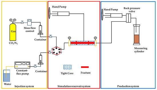 The key dominant feature difference between a tight reservoir and a traditional reservoir lies in the tight pore. The pore throat of the porous medium of the tight reservoir is very narrow, and its movable fluid saturation is very low. The fluid flow requires a higher-pressure gradient through the pore throat (when <50 nm), and the mobility of fluids is poor [1,2,3,4,5,6], so in the development of tight reservoirs, fracturing is a key technology with an indelible contribution to oil production. The main objective of fracturing is to reconstruct the reservoir seepage formation and to achieve the purpose of the effective expansion and development of the fracture through the mechanical mechanism and provide a more efficient and convenient flow channel for the crude oil [2,7]. However, according to the evaluation of the oil production of tight reservoirs both in China and America, the production rate of tight reservoirs decreases rapidly, without a long and stable production period [2,6,8,9,10,11]. Thus, it is difficult to obtain satisfactory oil recovery only relying on the depressurization process even with fracturing.
