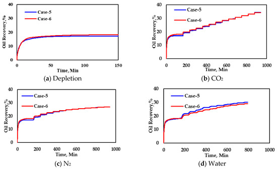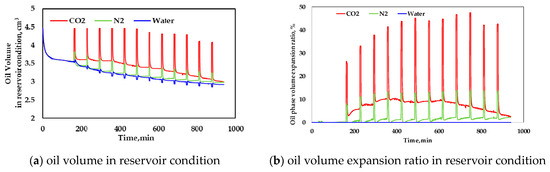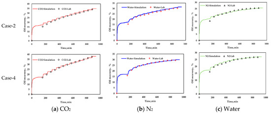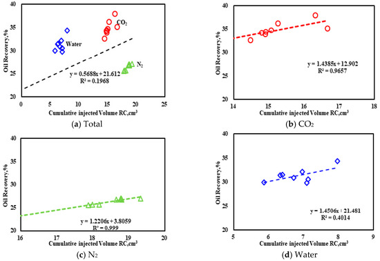 Then, we also found the relationship between the volume of the accumulative injection of fluid and the oil recovery under the reservoir conditions of different fluids (CO2, N2 and water) cannot be satisfactorily correlated (shown in Figure 11a). It shows that that the injectivity is only part of the basis for the EOR effect of fluids. Because of the obvious difference of EOR mechanism among the three fluids, the oil recovery only shows a good linear relationship with cumulative injected volume under reservoir conditions in same fluid cases (shown in Figure 11b–d).