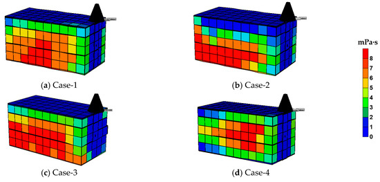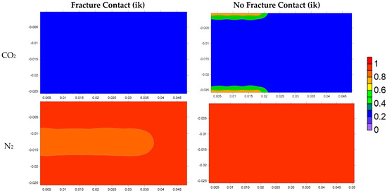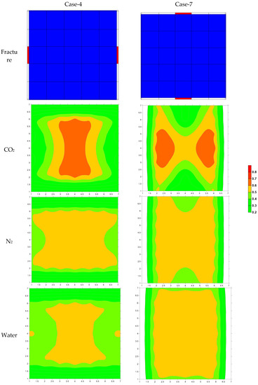 In this section, Case-4 and Case-7 are used to illustrate the mechanisms of permeability anisotropy by setting fractures in different directions. Figure 29 shows the oil recovery factor effect on surface conditions by using three different injecting fluids with fractures in different directions. The conclusion of this comparison is that permeability anisotropy plays a significant role in the water case (Case-7 is 4.38% higher than Case-4; but gravity has a negligible impact on CO2 and N2). The cross section of Cases-4 and -7 in k-j direction is specifically selected for analysis (Figure 30 and Figure 31). From the viscosity comparison (Figure 30), the viscosity reduction area in Case-4 is larger than the area in Case-7.
