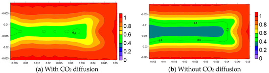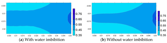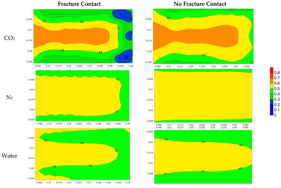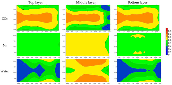 To further understand the EOR mechanisms of the three different injecting fluids, the influential factors in oil recovery are examined. One of the most important factors is the viscosity of the oil phase, which is affected by the thermodynamic conditions and oil composition. Figure 12 shows the viscosity of oil phase during the soaking process in the 12th cycle by using the three different fluids. It can be found that the effect of CO2 on crude oil viscosity reduction is very significant, especially the viscosity of crude oil near the well and near the interface of fractures has the most significant change from the initial 6 mPa·s to about 1 mPa·s. However, N2 is also mixed as a gas during the contact with crude oil, but there is no obvious viscosity reduction effect. After the water injection, the viscosity of crude oil may even increase to 7.5 mPa·s.