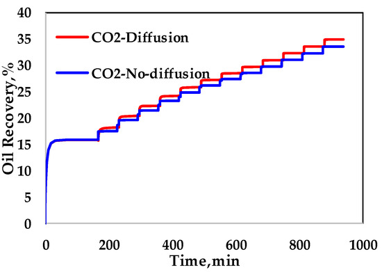 A considerable number of scholars have also focused on the study of CO2 in porous media and crude oil mass transfer mechanisms [15,29]. The mechanisms of CO2 EOR in tight oil reservoirs is considered to be significantly different from those in conventional reservoirs, due to the special petrophysical properties, reservoir fluid thermodynamics, and mass transport mechanisms. Diffusion is considered to be an especially important mechanism affecting gas transportat under tight reservoir conditions, and its effect on enhanced oil recovery of tight oil cannot be neglected based on the core scale experiments.