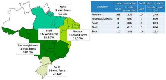 Since Brazil is a country with continental dimensions, the Brazilian electricity sector (BES) is divided into four interconnected submarkets, corresponding to the country’s geographic regions: North, Northeast, South and Southeast/Midwest. Figure 1 shows the high concentration (80%) of wind farms in the Northeast, a consequence of the presence of strong winds in the region and the complementarity between wind and water sources [3], in contrast to what happens in the Southeast/Midwest, which has only 0.55% of the projects. Most of the plants already under construction or planned for construction are also located in the Northeast, totaling 207 new ventures in the region of the 216 nationwide.