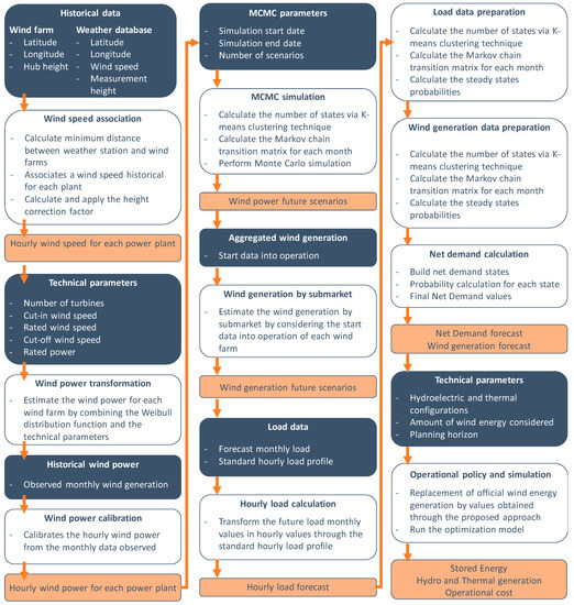 Figure 2 presents a graphical framework with a description of all the calculations. In the first stage, each plant is associated with a wind speed history, obtained through measurements stations, and that speed is converted into wind power through the combination of turbine technical parameters. The data are calibrated from observed wind generation values. In the second stage, future scenarios of wind generation for each power plant are simulated using the Markov chain Monte Carlo method. In order to build the wind power generation of an entire submarket, the start-up date of each plant is considered. In the third stage, the expected energy load is considered with hourly frequency, being constructed through load profiles and future values. The calculation of the net demand is done through the combination of possible states of energy load and wind generation and probabilities are associated with each state. After obtaining the expected values of wind generation and net demand, it is necessary to include these data in the Brazilian hydro-thermal dispatch by replacing the wind energy values considered by the BES with the values obtained through the proposed approach. Such dispatch is based on an optimization model, where the income inflow is the stochastic variable. The objective function intends to minimize the sum of immediate and future cost of fuel and energy deficit, under operational and security constraints. The future cost is a convex combination of the expected value of the future cost function and the Conditional Value at Risk (CVaR) of that function, in order to insert risk aversion [33].