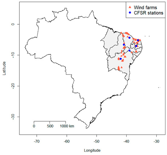 The Northeast region is composed by the states of Alagoas, Bahia, Ceará, Maranhão, Paraíba, Piauí, Pernambuco, Rio Grande do Norte and Sergipe, and has the longest coastline of the country’s regions (3000 km). According to the National Electric Energy Agency (Agência Nacional de Energia Elétrica—ANEEL), in July 2017 there were 209 wind farms in operation, accounting for 3.6 GW of installed capacity, 172 under construction or due to start construction in the near future, totaling an addition of approximately 4 GW in this region in the following years. Of these 172 wind farms under construction, only 74 will be in operation within the study horizon, totaling 283 undertakings considered for all future calculations.