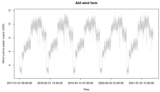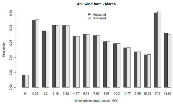 So far, all the wind speed considered is converted into wind power (), considering the turbine capacity factor. In this sense, the calibration year was the one when the data were obtained. That is, the calibration factor will be calculated from the observed monthly wind generation values and also the calculated monthly wind generation values, as in Equation 5, where is the calibrated wind power, is the total wind power calculated for month and wind farm and is the observed wind generation at month and wind farm :
