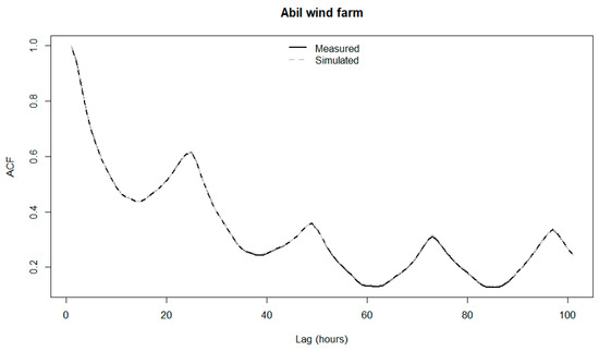 In the previous analysis we checked whether the wind series seasonal behavior was replicated in the simulated series. In the present analysis, we check if the intra-hour behavior is reproduced using the autocorrelation function, which presents the correlation between the time intervals. Figure 6 shows that the peaks are exactly in the multiple of 24 lags, and since we are dealing with an hourly time series, it is possible to conclude that the present method also reproduces the hourly behavior.