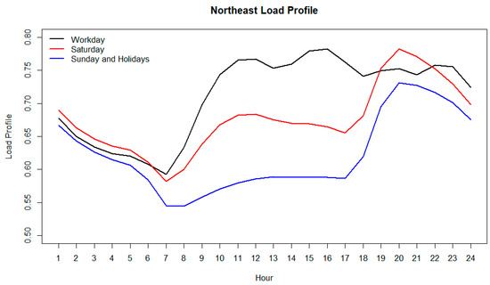 The first step involves obtaining the load profiles by type of day (workday, Saturday and Sunday/holidays) and month from a historical time series. Figure 8 presents the average monthly profiles for the Northeast submarket using data from January 2008 to December 2017. Note that during the early morning hours (1 a.m. to 5 a.m.) there is no significant difference in load between profiles, with the lowest values being on Sundays and holidays. However, during business hours (8 a.m. to 5 p.m.) there is a big difference between the profiles, where on weekdays the average load is much higher than on other days, as expected. In the evening (7 p.m. to 9 p.m.), this behavior is reversed, with higher load on Sundays and holidays.