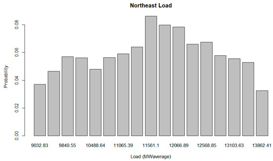 According to Leite da Silva et al. [28], to find the model parameters of a combination , let and denote the parameters associated with state of component and and be the parameters for state of component . Suppose that the combination of states and gives state of system . Assuming that states and are statistically independent, then the parameters of associated with state are and . Since the net demand can be characterized as the difference between the load and the generation, the penultimate step of this procedure combines the load and generation model parameters to derive the net demand states and probabilities and as in Equations (16)–(18):