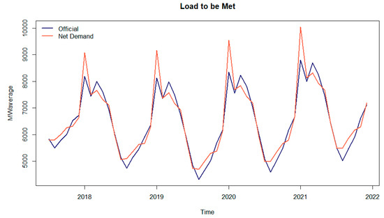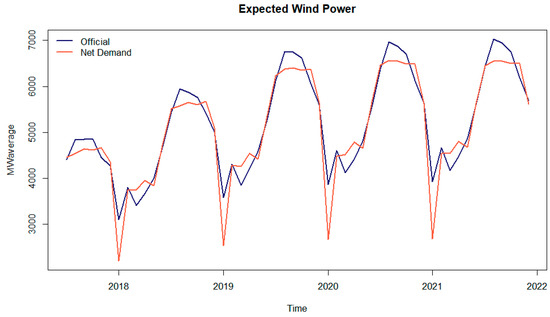 The first and most important result is the wind generation forecast for the next 5 years (or 60 months). In Figure 10, the forecast through the net demand approach and from the official sources are presented, where it is possible to observe that, on average, wind power generation predicted by the government is higher than the simulated value, especially regarding peaks and valleys. Apart from this, both have the same trend and behavior.