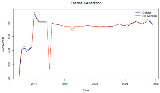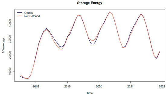 Considering the data from the load to be met (Figure 11), it is possible to evaluate, using the optimization dispatch model, the system’s behavior according to the power demand forecasts and simulated wind power generation. Figure 12 presents the energy storage and Figure 13 gives the thermal generation according to official sources and the net demand approach. From Figure 12 it is possible to notice that the energy stored considering the official forecasts is almost the same as in the net demand approach, but in the dry season the proposed methodology is more conservative.