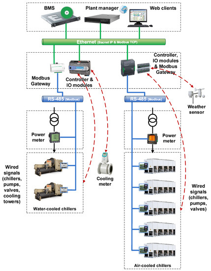 The first controller (AS by Schneider Electric) is used to implement control of air-cooled chillers and auxiliary elements (valves, primary pumps, etc.). Additional I/O modules capture signals from field elements and weather sensors. This device also works as a Modbus gateway to communicate with chiller cards and retrieve internal variables. The AS controller stores data in local logs and gradually transfers them to the BMS. The second controller (FEC by Johnson Controls), with integrated I/O modules, is used to implement control of water-cooled chillers and their auxiliary elements (valves, primary pumps, tower pump, cooling tower, fan, etc.) and to read building cooling meter. The FEC controller stores data in local log files and gradually transfers them to BMS too. Additionally, a protocol interface card (Trane PIC BAS-SVX08D-E4) has been installed in each water-cooled chiller to gain access to their internal variables and parameters. This card provides data using Modbus RTU protocol. A gateway (Com’X 510 by Schneider Electric) is necessary to convert Modbus RTU to Modbus TCP. On the other hand, power meters measure the main variables of electricity supply to both groups of chillers. They are also connected to Modbus RTU networks to communicate with BMS.