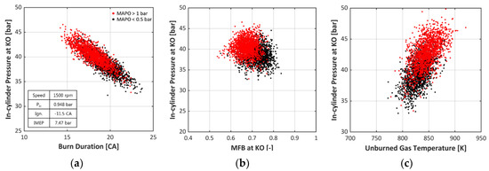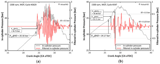 Two individual cycles are shown in Figure 3 as examples; Figure 3a shows a relatively heavy-knocking cycle (MAPO > 2 bar), and Figure 3b shows a weak knock cycle. Considering that the autoignition in the unburned gas region can be represented as a sudden increase in the in-cylinder pressure, the KOs are indicated with black circles in both figures. If a simple TVE method is applied to determine the KO, discrepancies exist in the pressure values between the actual KO and TVE KO, as is easily observed in the figures, and the error is even comparably larger in the weak knock cycle. Noting that these cycles are not extreme cases, as they were randomly chosen, the determination of the KO is a critical aspect of the knock analysis because even a small error in the KO can lead to a misunderstanding of the combustion.