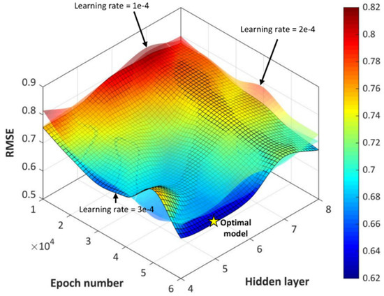 Figure 5 shows the result of the parametric optimization. A smaller RMSE value represents a higher model accuracy. To confirm that the models were not over/under fitted, every model was also verified by using the test data set. The best model was achieved in the condition where the number of hidden layers was five, the epoch number was 6 × 104 and the learning rate was 3 × 10−4. The best model was chosen as the smart KO model, and the model was extracted using Keras accessing TensorFlow. Finally, the model was applied as built-in code in MATLAB post-processing and utilized.