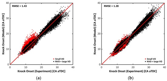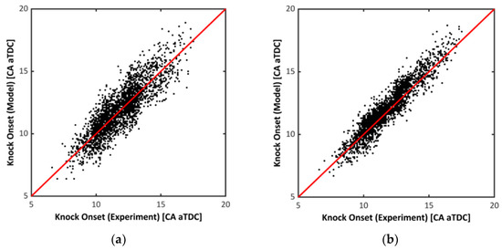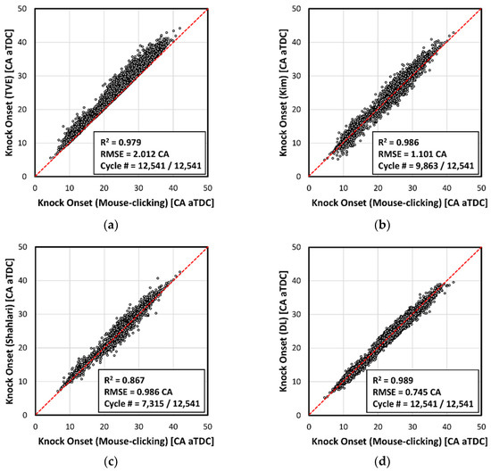 Kim’s method [11], shown in Figure 6b, showed an improved result on KO determination but in the same time, a deteriorated performance was observed with a massive loss of cycle data due to the calculation error; the proposed threshold value was immoderately high in the weak knock condition. Shahlari’s method [10], shown in Figure 6c, provided a more accurate determination than the others’; the RMSE was decreased. However, as a cycle was excluded if it did not meet any condition during the calculation, the larger data (over 40% of total cycle number) was lost.