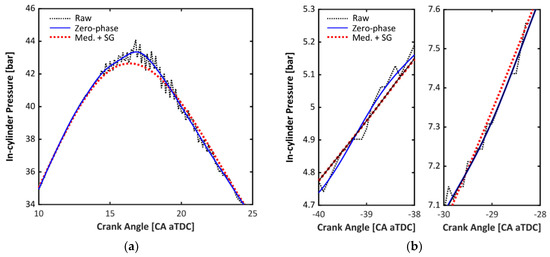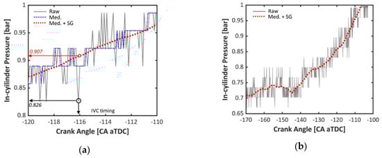 The reliable determination of the IVC pressure is one of the most important factors for the combustion analysis, as it is significantly influential to the whole process including compression and combustion, regardless of the analysis method. Therefore, a smooth filtering method was applied for the low-pressure region in this study. A 3rd-order and 151 frame-length Savitzky-Golay [41] smoothing filter was applied upon the median filter. The filtered signal is indicated with red lines in both Figure 7a,b, and it shows an improved performance in chasing the original signal.