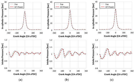 One-dimensional (1D) simulation results in motoring conditions: (a) 1500 rpm, WOT, INCam 30 CA advanced; (b) 2000 rpm, WOT, INCam 30 CA advanced; (c) 2000 rpm, WOT, INCam fully retarded.