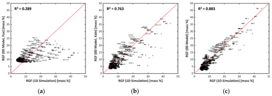 Figure 11a,b show the results of the 0D RGF models proposed by Fox et al. [15] and Kale et al. [16], respectively. As previously described, validation data was provided by a 1D simulation. Genetic algorithm was used for the optimization (re-calibration) of the coefficients of each model. In the figures, the x-axis indicates the RGF values from the 1D simulation results, and the y-axis indicates the calculated values of the 0D RGF model. Kale’s model shows acceptable accuracy, while Fox’s model shows poorer accuracy. However, there were underestimated and overestimated data points, as can easily be observed in Figure 11b. Detailed explanations of the two models are provided in the references and thus skipped in this paper.