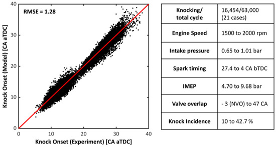 During the parametric study, the number of hidden layers was varied from four to eight, the epoch number was tested between 1 × 104 to 6 × 104, and the learning rate was changed from 1 × 10−4 to 3 × 10−4. A total of 90 model structures were tested. The objective function for the minimization was the root mean squared error (RMSE) (shown in Equation (7)) between the modeled KO and actual KO achieved by the mouse-clicking method. Mouse-clicking KO data was manually achieved observing the sudden pressure increase in cycle-by-cycle pressure trace. 3,500 data sets were utilized for the supervised learning based on the aforementioned mouse-clicked KO data, and the model was validated with an additional 1179 cycle data sets to validate the model’s accuracy: