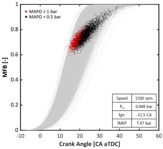 The threshold for the judgement of the knocking cycle can be varied by changes in the engine material and structure. In addition, there is still a dilemma on which index should be applied [6]. Knocking indexes based on the in-cylinder pressure have been well described in previous studies [10,11,38]. To simultaneously achieve the steady-state condition and a large number of cycle data for a high-fidelity model, a long test duration was essential in this study. Thus, as a slightly low threshold was required to prevent engine failure, the maximum amplitude of pressure oscillation (MAPO) TVE method, shown in Equation (5), was introduced to determine the knock occurrence; the cycle was determined as a knocking cycle if the maximum amplitude of the filtered pressure signal exceeded the threshold of 0.5 bar. Applying this threshold could detect the autoignition at a lower intensity than that of a normal acoustic knock. As knock generally occurs near after the TDC during combustion, the window was set from 30 CA bTDC to 60 CA after top-dead center (aTDC):
