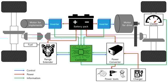 In the case of series hybrid vehicles [8,10,25], such as Re-EVs, the generator is operated at a fixed point based on the state of charge (SOC) of the battery, because the internal combustion engines in serial hybrid vehicles are not used for driving. In particular, Re-EVs consist of an engine and generator, i.e., a genset, which could provide extra electric power for charging the on-board battery, thus extending the traveling distance of the Re-EVs. [1,4,5,6,7,12,13,14,15,16]. This increase of available energy can make Re-EVs suitable for use as various purpose-built vehicles, such as agricultural and industrial vehicles. Vehicles serving multiple functions, such as agricultural and industrial vehicles, often use battery power in addition to combustion engines, so it is not appropriate to control only the power, used for driving.