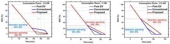 Figure 2 shows the variations in generator operating point based on power consumption by the user. In particular, the proposed algorithm was compared to a conventional algorithm as well as a pure electric vehicle under different power consumption conditions; for this purpose, it was assumed that the conventional algorithm operated the generator at a constant SOC of 20%. Using the proposed algorithm, the generator is operated late in the case the user’s power consumption is low, thus extending the operating time of the EV system; in contrast, when the user’s power consumption is high, the generator is operated sooner so that all the remaining fuel could be utilized.