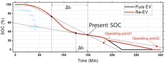 In real-world environments, wherein an actual vehicle is used, the battery usage graph is nonlinear. To obtain the appropriate generator operating point, it is necessary to determine the power consumption based on the user’s power consumption trend, i.e., based on the slope of the graph, as shown in Figure 3. In particular, the slope of the graph is the change in SOC per unit time; this is represented by Equation (8):