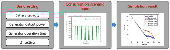 The key of the energy resource management algorithm is to appropriately determine current consumption power values. To identify the characteristics of the proposed algorithm and set the appropriate unit time for consumption power, a simulator capable of comparing the generator operating points and SOC change graphs based on unit time change was constructed, as shown in Figure 4. In addition, the results for the existing algorithm operating at a fixed point as well as the SOC change graph of an EV without a generator were also compared.