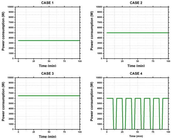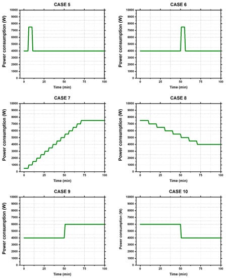 Simulations were performed for 10 power consumption scenarios (Cases 1–10) reflecting various power consumption patterns (constant, increasing, decreasing, irregular) as shown in Figure 5.