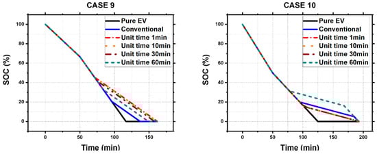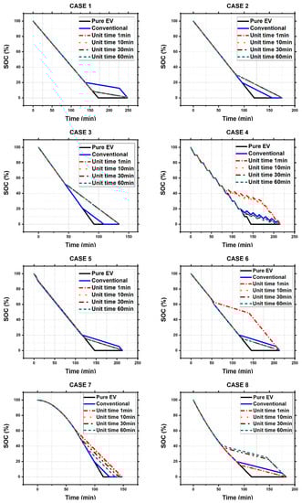 In summary, when the SOC change graph is closer to a linear form, the change in the slope is not significant; therefore, changes caused by the unit time difference are not significant. In contrast, in nonlinear consumption patterns, the algorithm becomes insensitive or hypersensitive depending on the unit time setting.