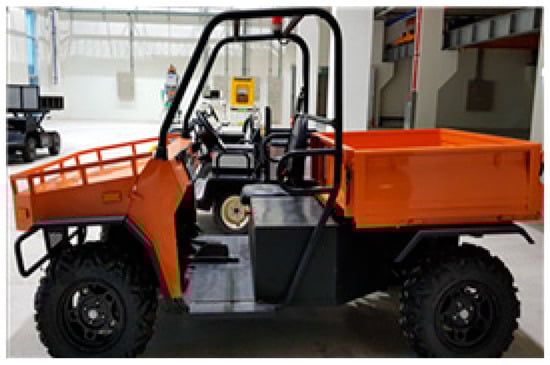 As shown in Figure 7 and Table 3, the driving test was conducted using an agricultural utility vehicle with a 10-kWh battery capacity using a motor with a 7-kW rated power capability, which is quite similar to the configuration of the Re-EV considered in this study. Data on the SOC and power consumption were acquired using the battery management system (BMS) mounted on the vehicle.