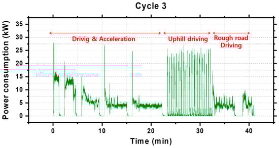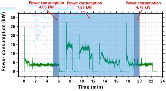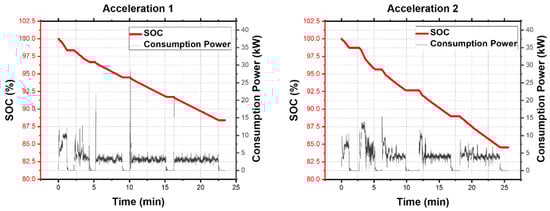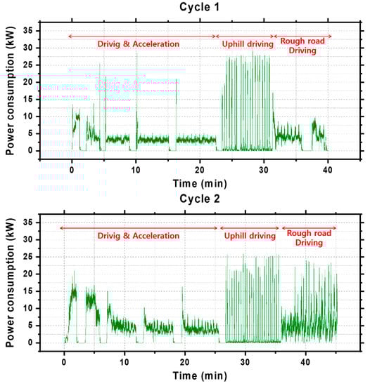 To observe the increase in power consumption based on acceleration, the vehicle was tested while it was repeatedly driven and stopped. In the beginning of experiment, high power consumption was observed for approximately 5–15 min, as shown in Figure 8. In addition, when it was driven after stopping, high power consumption was observed for a considerably short period of time.