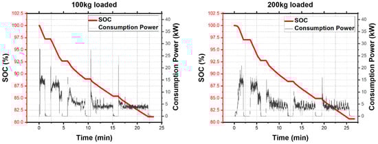 To observe the increase in power consumption based on loading, the vehicle was loaded with 100 kg and 200 kg and it was repeatedly driven and stopped in the same manner as in the abovementioned test for acceleration. The high-power consumption pattern for a short period of time was the fixed to be the same as the test for acceleration. The overall average power consumption was slightly higher compared with an unloaded vehicle, as shown in Figure 9.