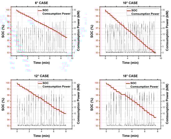 Figure 6 shows the simulation results for power consumption scenarios. In Cases 1–3, the slope of the SOC change graph is constant when constant power is utilized. Therefore, the generator operating point did not change based on unit time, instead it changed based on the difference in power consumption.