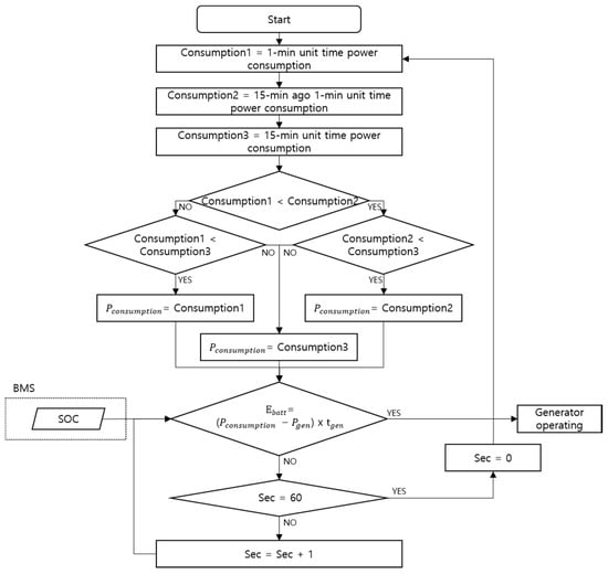 Figure 13 shows the flowchart of the proposed algorithm; in particular, the algorithm determines the operation of the generator by continuously monitoring whether the condition of situation 8 are met. Also, the algorithm monitors the change in SOC once a minute and updates Consumption 1, Consumption 2 and Consumption 3, and then selects the lowest value from among them. The proposed algorithm determine whether to operate generator or not, based on selected to be the lowest value.