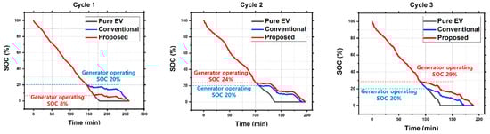 Based on the data obtained through an actual driving test, a simulation was performed by applying this data to the proposed algorithm. When Cycle 1 data was applied, the generator was operated late to maximize the benefits of the EV. In contrast, when Cycles 2 and 3 data were applied, the generator was operated early to utilize all the remaining fuel, as shown in Figure 15. Consequently, it was confirmed that the generator was operated based on the user’s power consumption trend, and therefore, the driving range was extended.